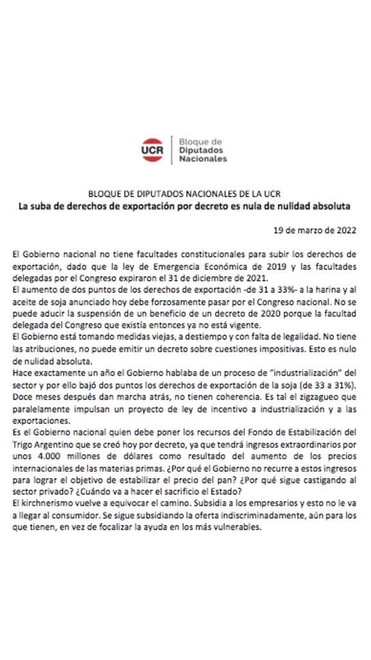 Pero es mucho lo que ha ocurrido desde entonces. El texto que publicaron los diputados del radicalismo sostiene que "el Gobierno nacional no tiene facultades constitucionales" para incrementar las retenciones, dado que "la Ley de emergencia económica de 2019 y las facultades delegadas por el Congreso expiraron el 31 de diciembre de 2021".