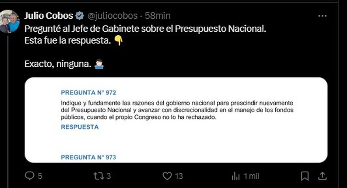 Además de la difusión de la respuesta vacía a su pregunta, el ex gobernador de Mendoza amplió su concepto, siempre relacionado con el tema del presupuesto: "No tenemos presupuesto, pero no por falta de voluntad de Diputados, sino por propia decisión de Poder Ejecutivo".