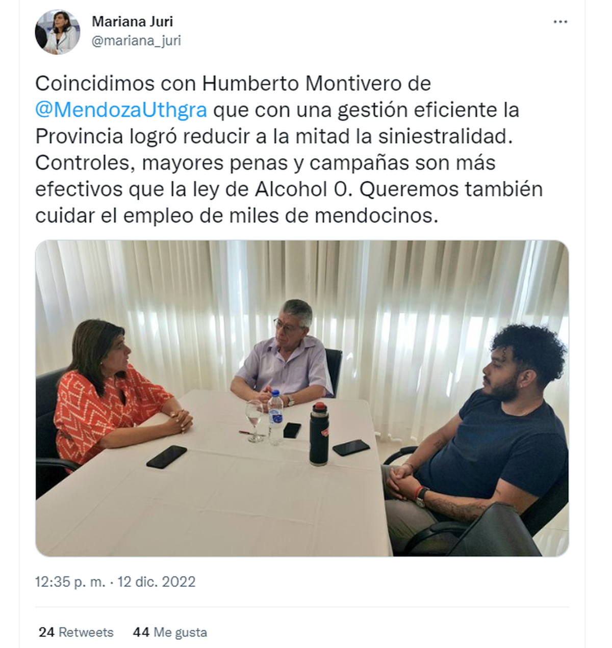 "Nos reunimos con referentes del gremio que están muy preocupados porque entienden que si sale esta ley les afectará las fuentes de trabajo. Ellos marcan que es muy peligrosa y engañosa la idea de que quien toma una copa de vino es un asesino al volante, sobre todo porque la experiencia de Mendoza puede mostrar que con 0,5% de tolerancia para los conductores y con controles en 5 años se han reducido los accidentes", contó Juri, luego de charla que mantuvo con Humberto Montivero, secretario general del gremio en la provincia.