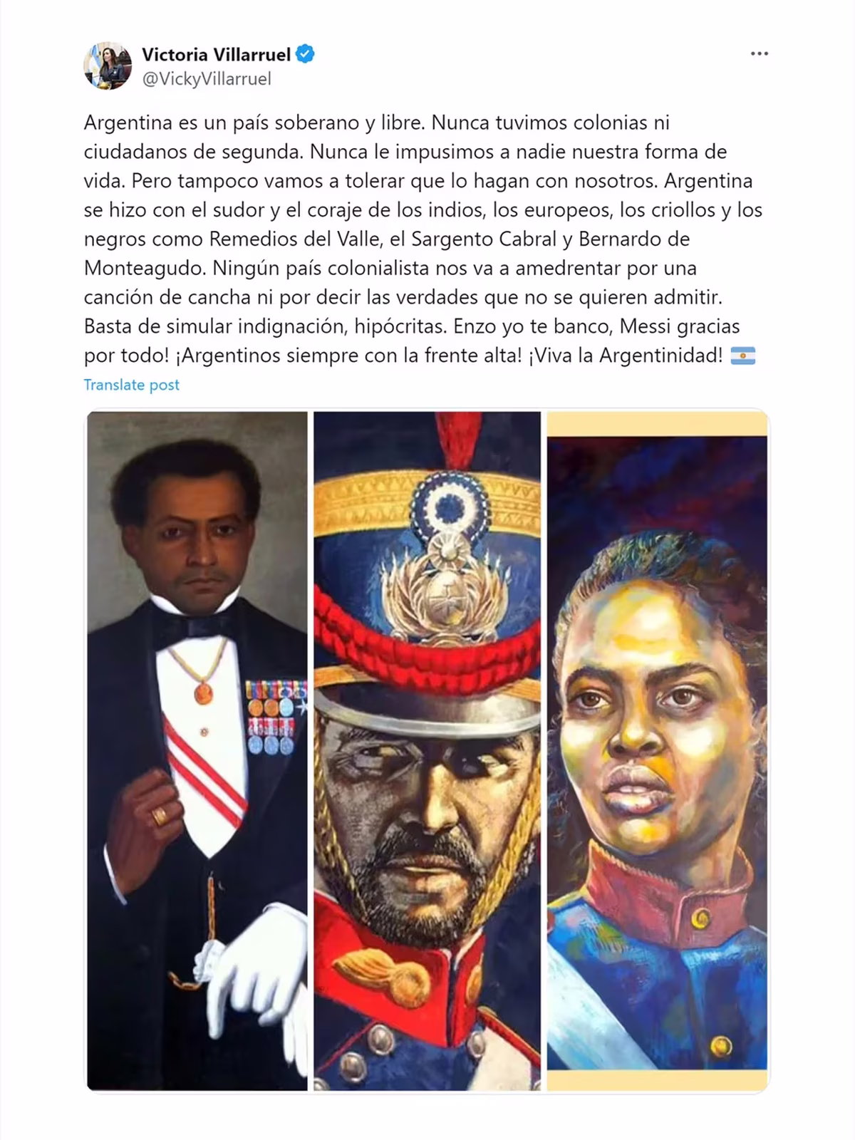 El mensaje de la vicepresidenta Villarruel desde su cuenta de X que despertó la tensión con las autoridades de Francia había sido para defender a Enzo y a la Selección: "La Argentina es un país soberano y libre. Nunca tuvimos colonias ni ciudadanos de segunda. Nunca le impusimos a nadie nuestra forma de vida. Pero tampoco vamos a tolerar que lo hagan con nosotros. Argentina se hizo con el sudor y el coraje de los indios, los europeos, los criollos y los negros como Remedios del Valle, el Sargento Cabral y Bernardo de Monteagudo. Ningún país colonialista nos va a amedrentar por una canción de cancha ni por decir las verdades que no se quieren admitir. Basta de simular indignación, hipócritas. Enzo yo te banco, Messi gracias por todo! ¡Argentinos siempre con la frente alta! ¡Viva la Argentinidad".