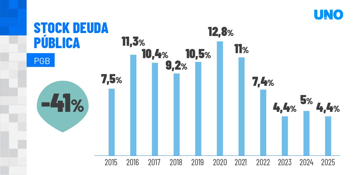 "En aquel momento (sigue aludiendo a fines del 2015 que fue cuando asumió la gestión radical) la deuda representaba el 7,5% del PBG, es decir Mendoza debía el 7,5% de todo lo que producía, hoy está en 4,4%, es decir bajó el 41% en término de la economía".
