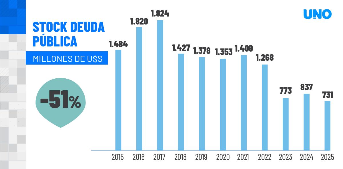 "En el 2015 la deuda era de 1.484 millones de dólares, hoy está por debajo de los 700 millones de dólares, es decir bajó el 51%. Eso en stock, es el total de lo que deben todos los mendocinos", aseguró Kerchner.