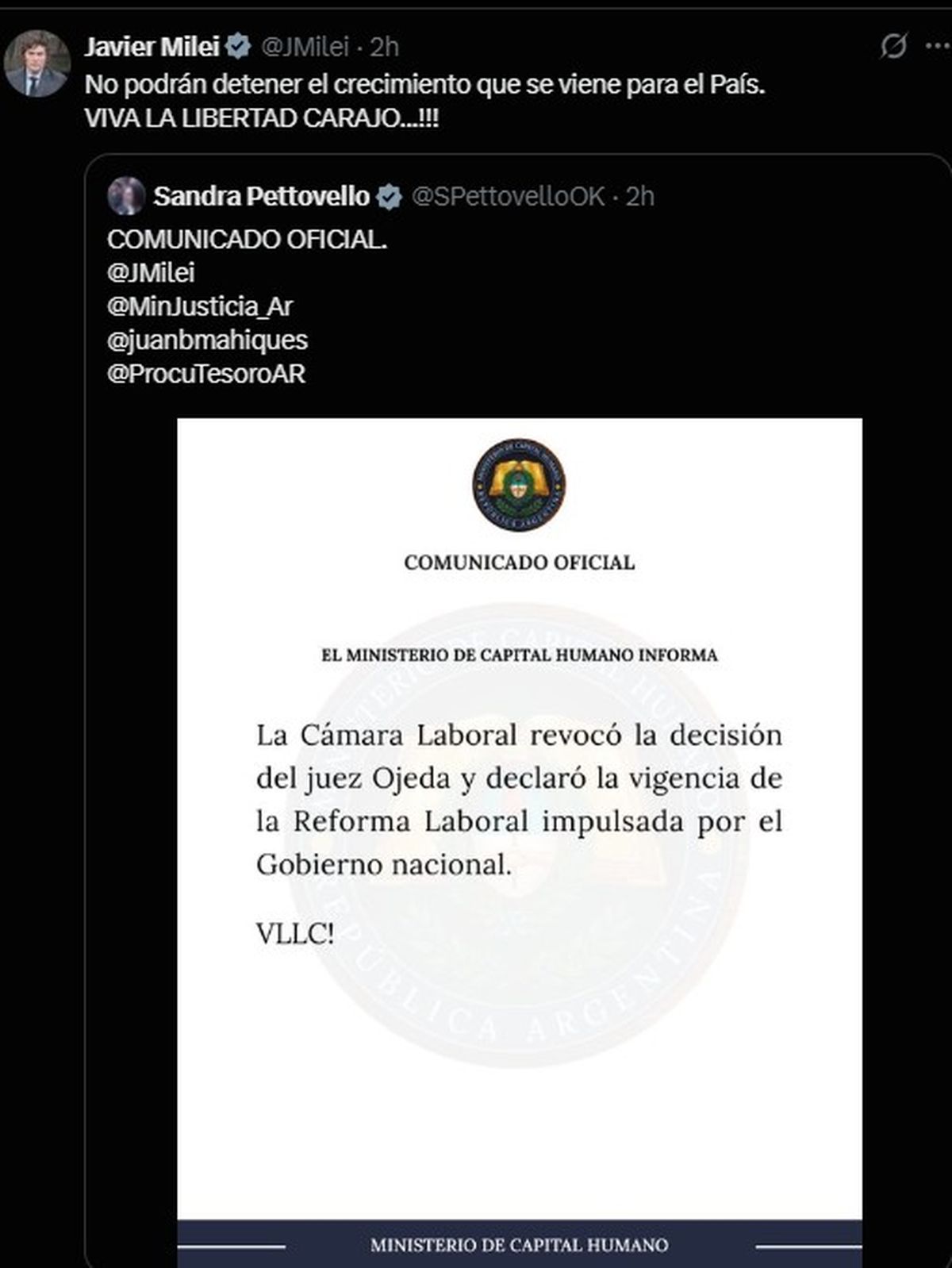 "Intentaron frenarla: no lo lograron. La Cámara Laboral revocó la medida cautelar que suspendía la ley de Modernización Laboral. Fin", fue el mensaje en redes de Manuel Adorni.