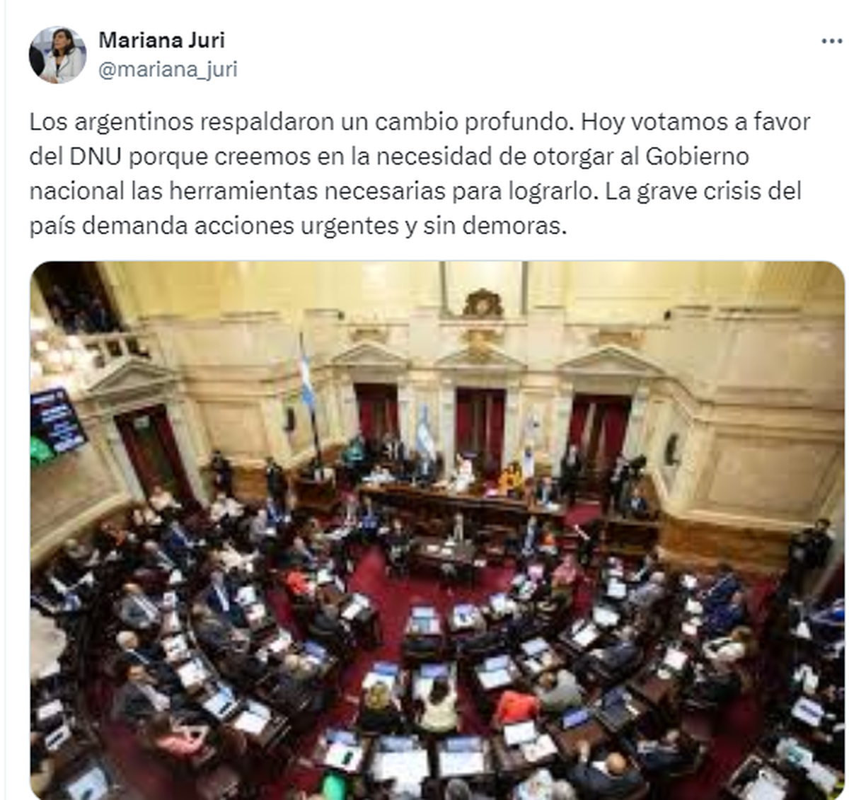 Por Mendoza, la senadora Mariana Juri analizó la sesión de este jueves, a través de su cuenta de X y recalcó: "Los argentinos respaldaron un cambio profundo. Hoy votamos a favor del DNU porque creemos en la necesidad de otorgar al Gobierno nacional las herramientas necesarias para lograrlo. La grave crisis del país demanda acciones urgentes y sin demoras".