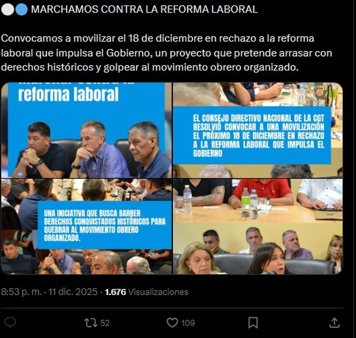 El Consejo Directivo de la CGT rechazó este jueves la reforma laboral que impulsa Javier Milei, al advertir que el país está “empobrecido, sin inversión económica y que sufre industricidio”, y anticipó que llevará adelante una movilización a Plaza de Mayo el jueves próximo (18 de diciembre) a las 15.