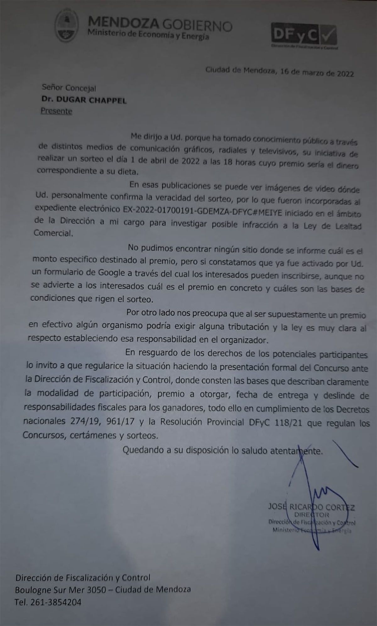 El director de Fiscalización y Control del Ministerio de Economía, José Cortez, abrió un expediente en el que se investiga si el concejal de la Ciudad de Mendoza Dugar Chappel cometió o no una infracción a la Ley de Lealtad Comercial al anunciar por redes sociales que sorteará su dieta.