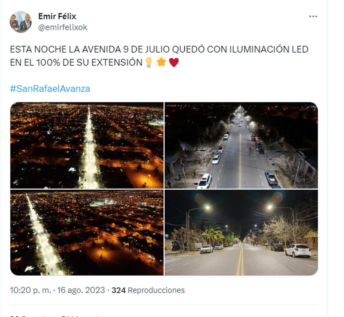 Emir Félix, y su candidato a sucederlo, su hermano Omar, protagonizaron una verdadera maratón de inauguraciones de obras en San Rafael, incluso hasta el último día en que la ley electoral se lo permitía, el pasado 18 de agosto. Mostraron luminarias, asfalto y redes de agua, y coronaron esa semana inaugurando una plaza en Pueblo Diamante.