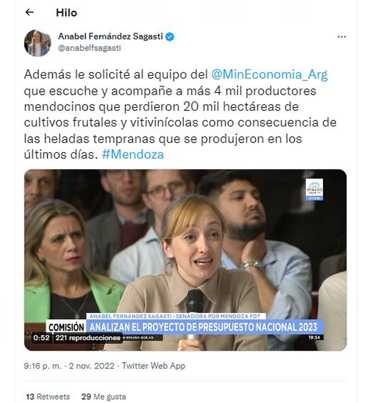 Cuando aún nadie sabía de las intenciones de Massa, la primera en dar un indicio de las gestiones que hacía en Casa Rosada fue la senadora kirchnerista Anabel Fernández Sagasti, que el 2 de noviembre, un día después de las desastrosas heladas, tuiteaba: "Le solicité al equipo del Ministerio de Economía que escuche y acompañe a más 4 mil productores mendocinos que perdieron 20 mil hectáreas de cultivos frutales y vitivinícolas como consecuencia de las heladas tempranas que se produjeron en los últimos días".