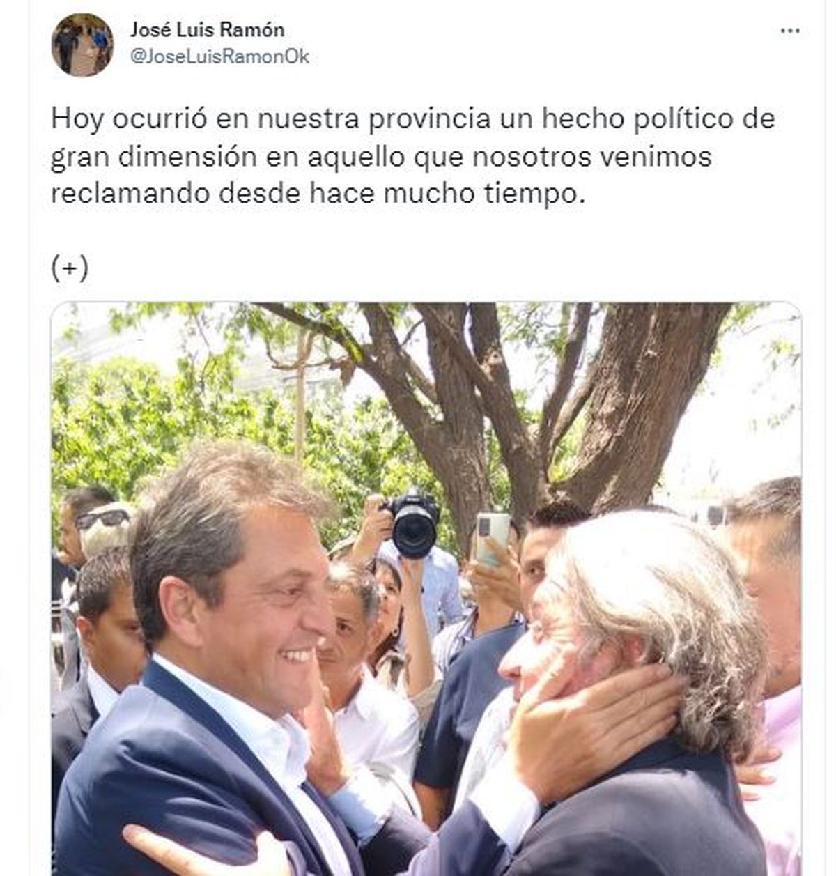 Este lunes Ramón estuvo en la primera fila de los legisladores que asistieron al acto del INTA, y como era de esperar acudió a abrazar a su amigo y se encargó de reflejar el momento en su perfil de Twitter.