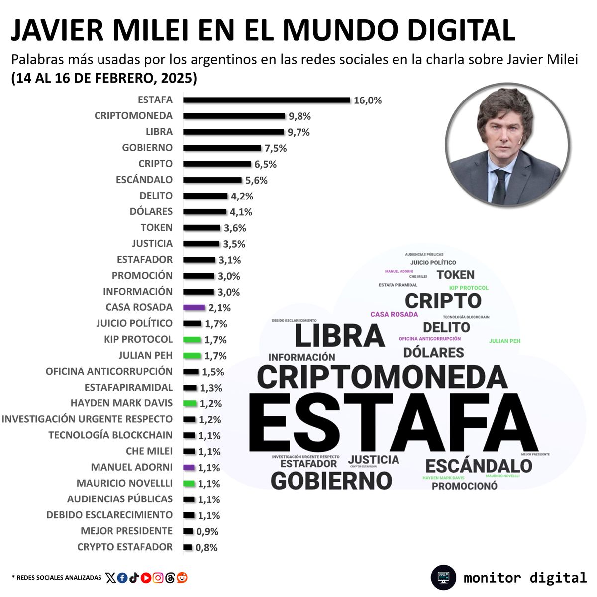 Además de las denuncias y las críticas de sus aliados, el presidente Javier Milei enfrenta una crisis de credibilidad tras el escándalo por promocionar la criptomoneda $LIBRA. Según un estudio de Monitor Digital, el escándalo consolidó "estafa" como la principal palabra clave utilizada en redes para atacar la figura del Presidente.