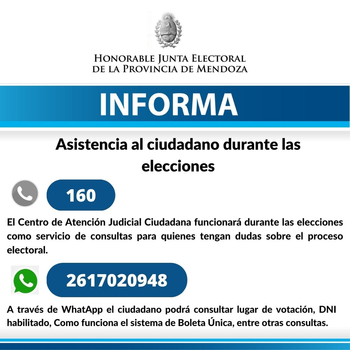 Se trata de la línea telefónica 160, que funcionará de 8 a 19 horas, y de la línea de Whatsapp 261-7020948, adonde la ciudadanía que votará podrá hacer todo tipo de consultas.