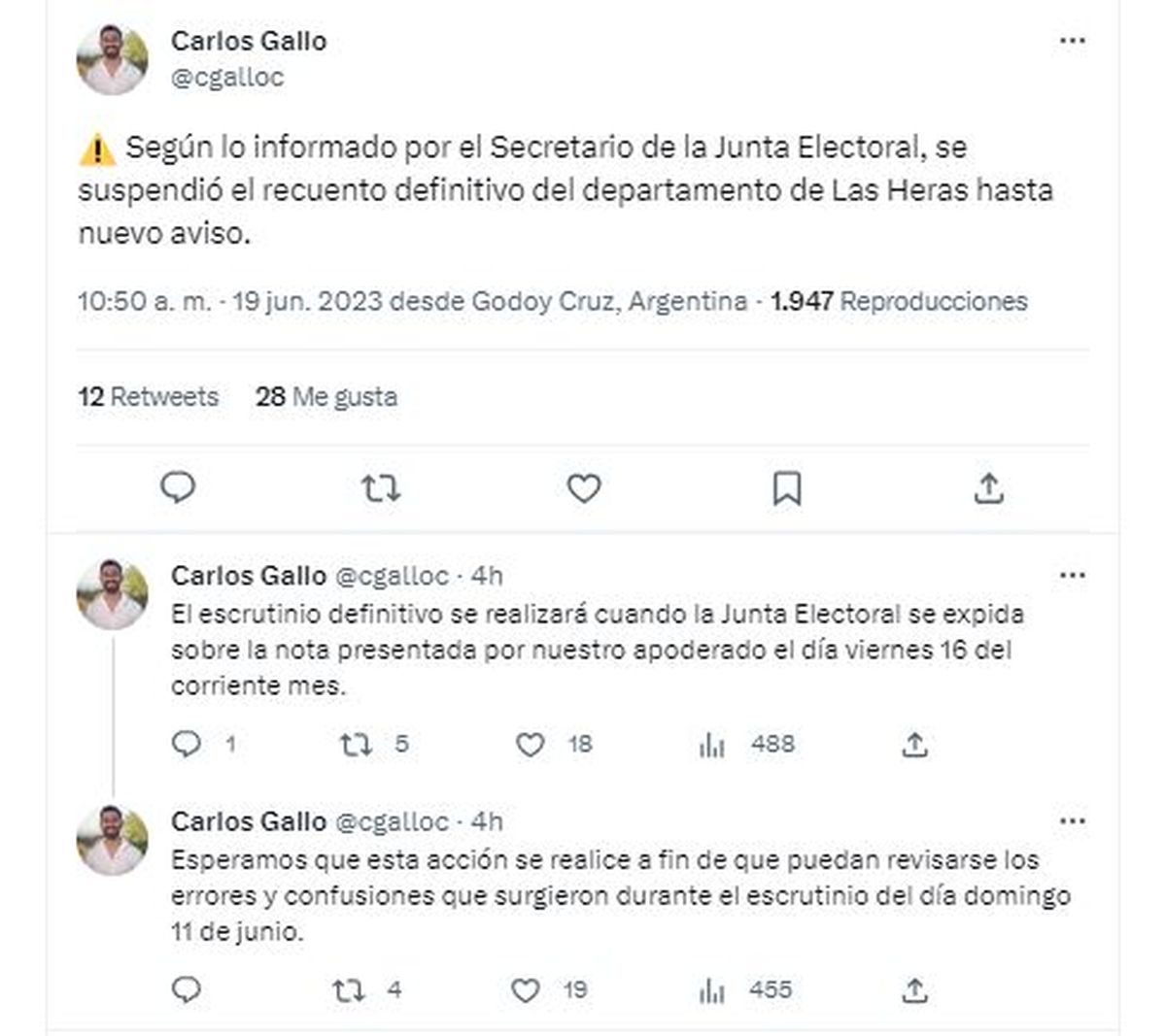 Ahora, ante el pedido del titular de la ANSES, la Junta decidió posponer el escrutinio definitivo de Las Heras que se iba a hacer este lunes para resolver antes si avala o no el pedido de Gallo. Así lo comunicó el mismo precandidato y lo confirmaron desde la Junta Electoral.