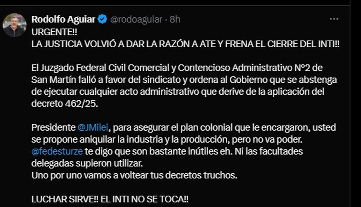 “Presidente, para asegurar el plan colonial que le encargaron, usted se propone aniquilar la industria y la producción, pero no va poder. Sturzenegger, te digo que son bastante inútiles eh. Ni las facultades delegadas supieron utilizar. Uno por uno vamos a voltear tus decretos truchos. ¡Luchar sirve! ¡El INTI no se toca!”, expresó desde sus redes sociales.