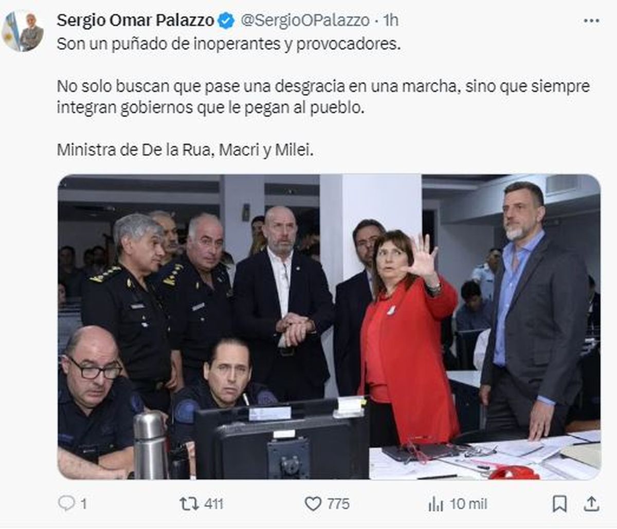 El diputado nacional mendocino y titular de la Asociación Bancaria, Sergio Palazzo, cuestionó el operativo de seguridad durante la movilización. Calificó a la ministra de Seguridad, Patricia Bullrich y al titular de la misma área de la Ciudad de Buenos Aires, waldo Wolff, de inoperantes y provocadores.