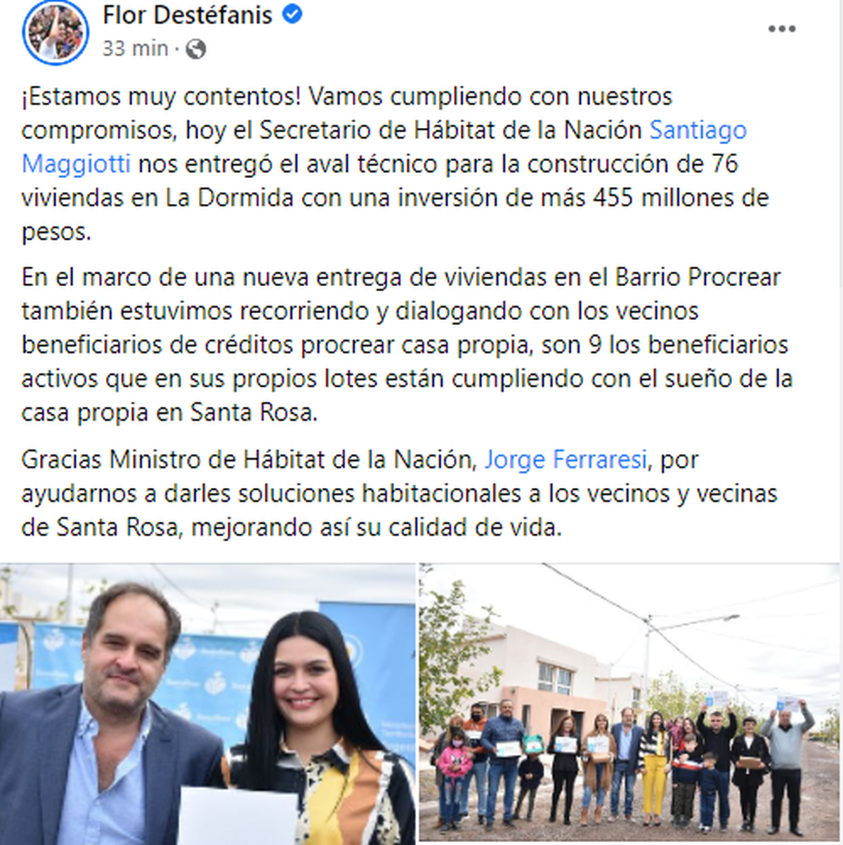 Esas viviendas del Procrear II se sumarán a las que el mismo funcionario entregó este viernes en La Dormida, Santa Rosa, y a las 76 que ya tienen el aval técnico, en las que la Nación invertirá $455 millones para concretarlas en la comuna que lidera Flor Destéfanis.
