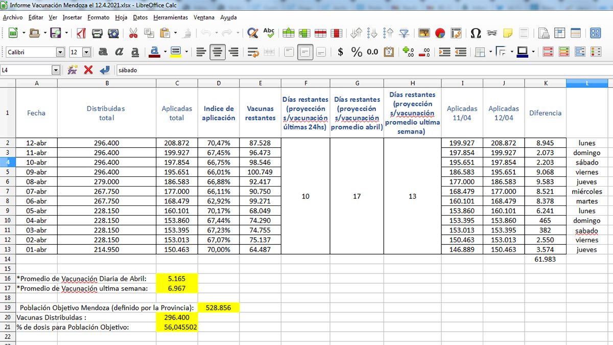 Lo real es que la información nacional oficial indica que al 12 de abril Mendoza contaba con 296.400 vacunas distribuidas, de las que ya se aplicó el 70,47%, correspondiente a 208.872 vacunas. Por ello es que surge el número de 87.528 vacunas en stock. Se informa también allí que la Provincia ha definido como "población objetivo" a vacunar a 528.856 personas y que el porcentaje de vacunas recibidas hasta ahora alcanza al 56% de ese objetivo.