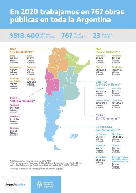 Todas estas obras y proyectos de infraestructura pueden visualizarse a través de la plataforma MapaInversiones (https://mapainversiones.obraspublicas.gob.ar), creada para facilitar el conocimiento, el acceso a la información y el control ciudadano para el seguimiento de la ejecución de las obras públicas, que se van actualizando en forma gradual e incremental, una vez que cumplen con distintos criterios.