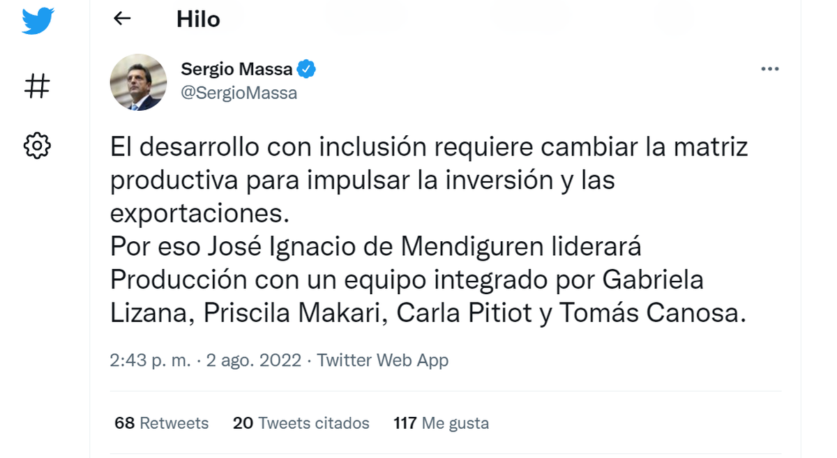 Según un tuit que el mismo superministro difundió en la tarde de este martes, la hoy directora del Banco Bice Fideicomiso, sumará su mirada al equipo de Producción que comandará "el Vasco" José Ignacio de Mendiguren, quien asumirá como secretario de Producción.
