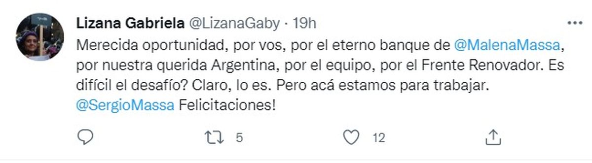 Lizana había sido de las primeras en festejar la posibilidad de que Massa recalara en el Gabinete, y el jueves pasado cuando finalmente el rumor de su asunción como ministro de Economía, Desarrollo Productivo y Agricultura tomó forma, fue la primera mendocina en remarcar que era su momento para demostrar su vocación de servicio y de hacerse cargo de la situación económica del país.