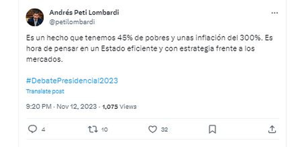 El radical, sin apoyar abiertamente a Javier Milei se encargó de resaltar los números de la pobreza y la inflación con los que dejará su cargo Sergio Massa: "tenemos 45% de pobres y una inflación del 300%" posteó y pidió un "Estado eficiente con estrategia frente a los mercados".