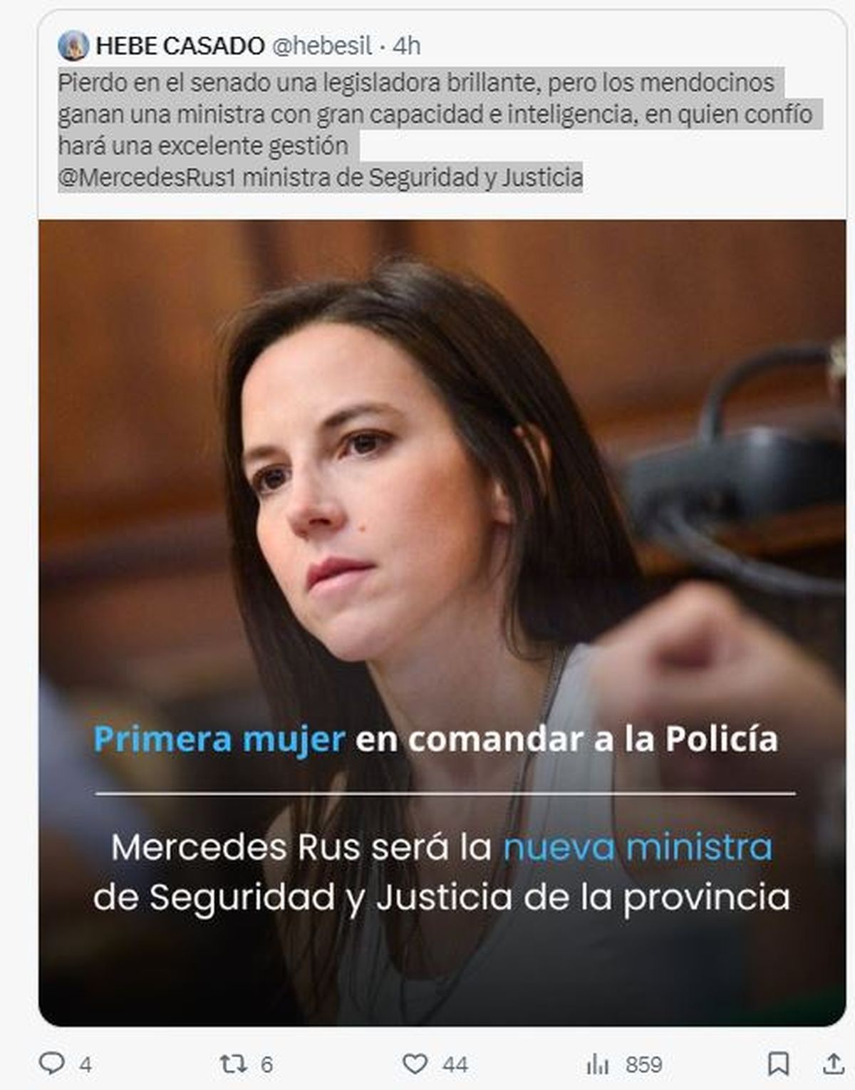 "Pierdo en el Senado una legisladora brillante, pero los mendocinos ganan una ministra con gran capacidad e inteligencia, en quien confío hará una excelente gestión, Mercedes Rus, ministra de Seguridad y Justicia", publicó en X la vicegobernadora electa Hebe Casado.