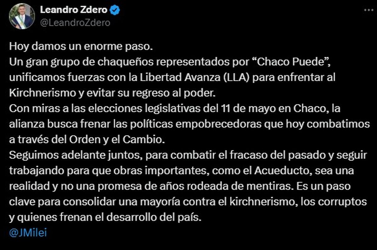 La UCR anunció la primera alianza electoral con La Libertad Avanza (LLA) y tuvo como escenario la provincia de Chaco. El gobernador radical, Leandro Zdero, fue el encargado de dar a conocer en las redes sociales la estrategia partidaria.