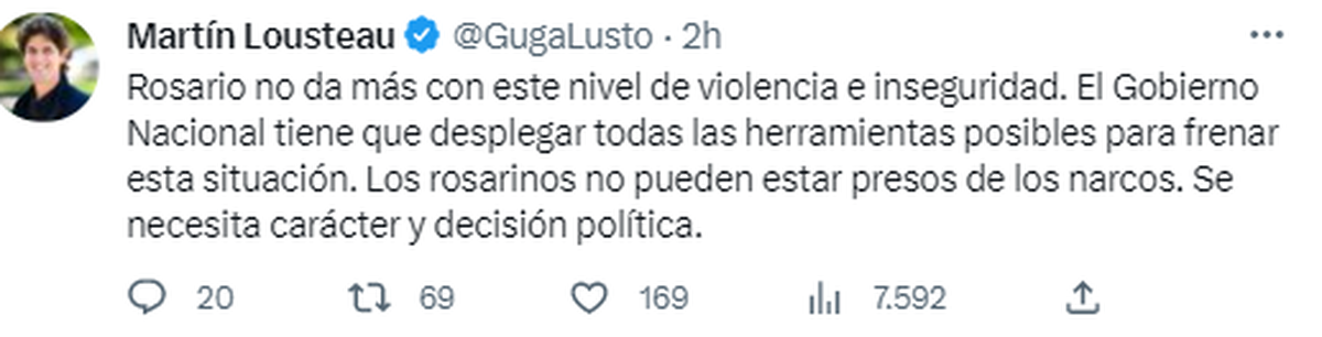 En la misma sintonía se manifestó el senador nacional de la UCR - Evolución, Martín Lousteau, al plantear que Rosario "no da más con este nivel de violencia e inseguridad", y reclamó que la administración de Alberto Fernández debe "desplegar todas las herramientas posibles para frenar esta situación".