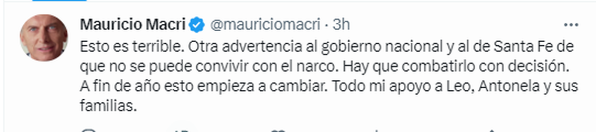 "Esto es terrible. Otra advertencia al Gobierno Nacional y al de Santa Fe de que no se puede convivir con el narco", tuiteó el ex mandatario, y continuó: "Hay que combatirlo con decisión. A fin de año esto empieza a cambiar. Todo mi apoyo a Leo, Antonela y sus familias".