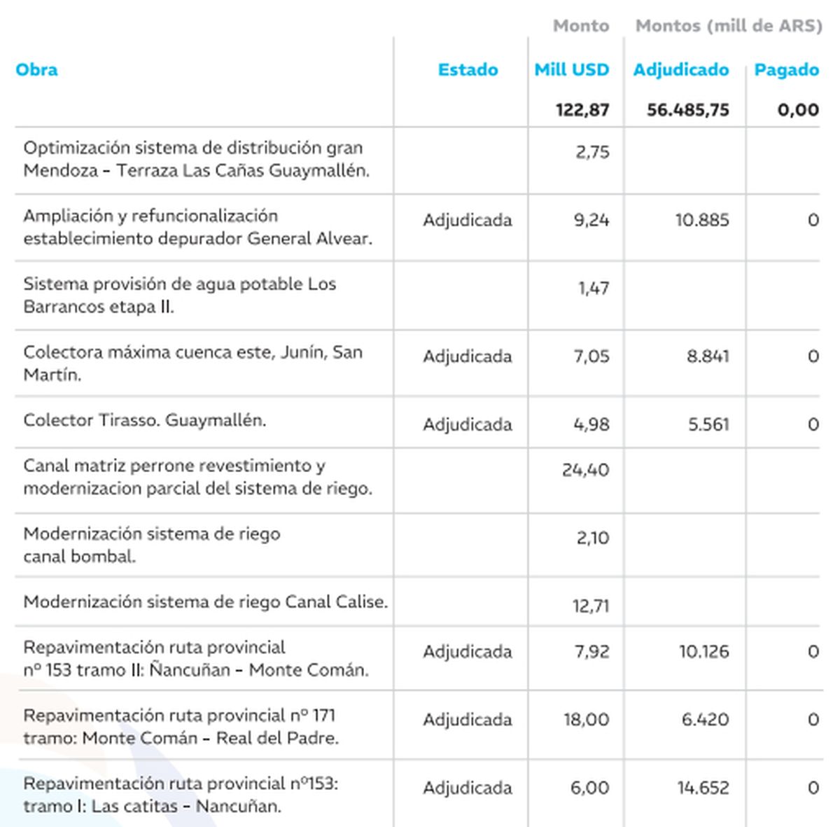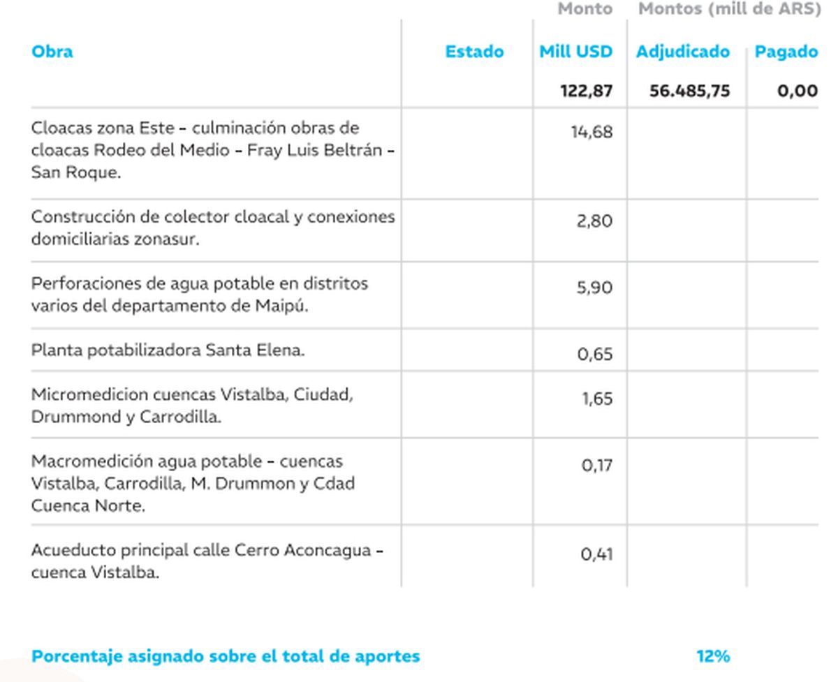 Del total, solo seis ya tienen adjudicados fondos, aunque aún no se ha realizado ningún desembolso. El porcentaje asignado para las obras sobre el total de aportes equivale al 12%.