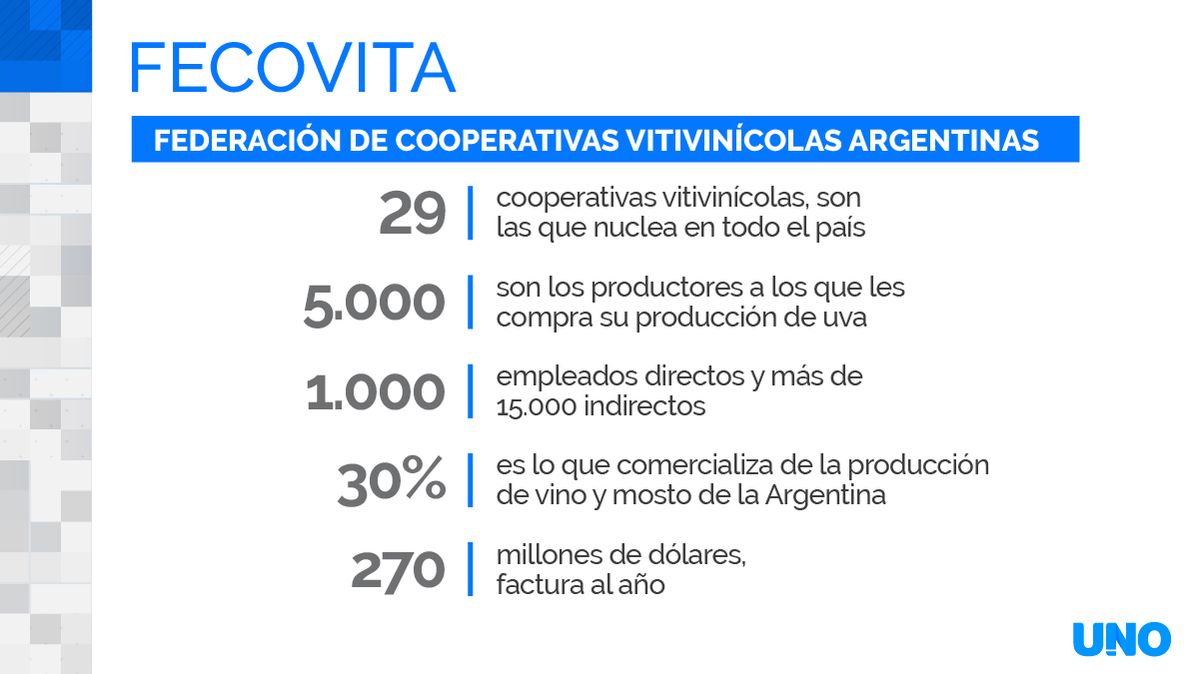 Sólo por dar algunos números: esa federación es la mayor productora de vino en volumen de la Argentina, nuclea a 29 cooperativas, le compra uva a unos 5.000 productores, sostiene a unos 15.000 empleados indirectos y factura anualmente cerca de 270 millones de dólares. Fecovita, cuyo presidente es Rubén Panella, es dueña de reconocidas marcas de vino como Toro, Toro Viejo, Estancia Mendoza, Canciller, Dilema, Los Helechos y Finca Magnolia.