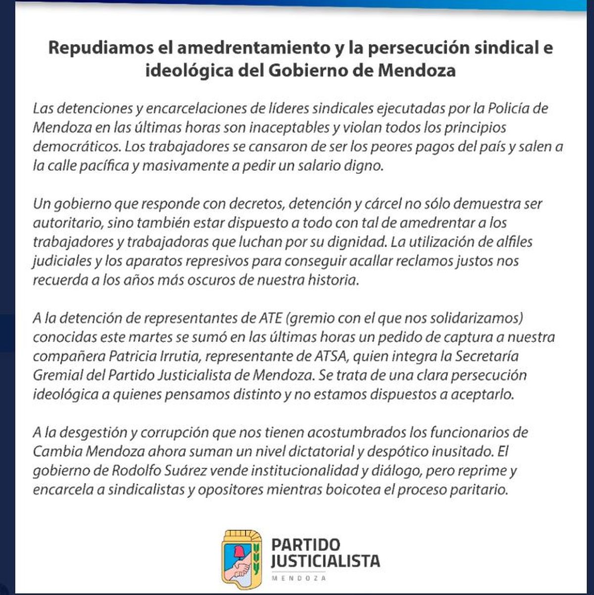 El Partido Justicialista se expresó con un comunicado bajo el título "repudiamos el amedrentamiento y la persecución sindical e ideológica del Gobierno de Mendoza".