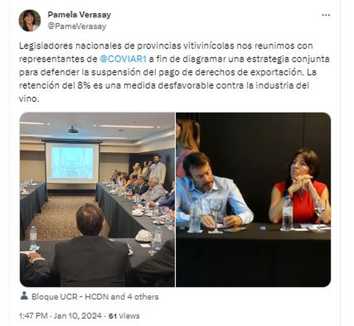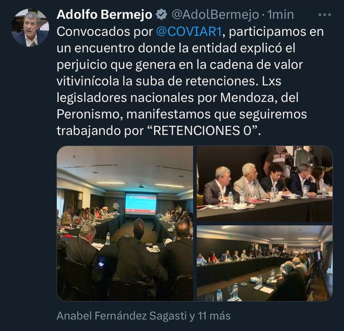 Previamente el titular de la Coviar, el ministro de Producción de Mendoza, Rodolfo Vargas Arizu y el de Economía de San Juan, Gustavo Fernández se habían reunido con el titular de Bioeconomía de la Nación, Fernando Vilella, para transmitirle la preocupación de la industria vitivinícola por el regreso de las retenciones al vino, pero regresaron a sus respectivas provincias sin el gesto que esperaban.