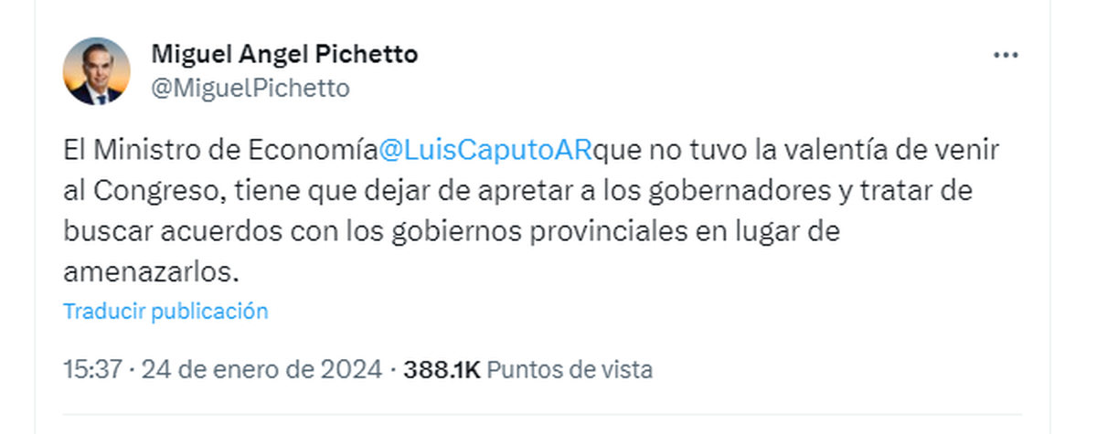 Horas después, Pichetto -presidente del bloque "dialoguista" Hacemos Coalición Federal- posteó que "el Ministro de Economía Luis Caputo, que no tuvo la valentía de venir al Congreso, tiene que dejar de apretar a los gobernadores y tratar de buscar acuerdos con los gobiernos provinciales en lugar de amenazarlos".