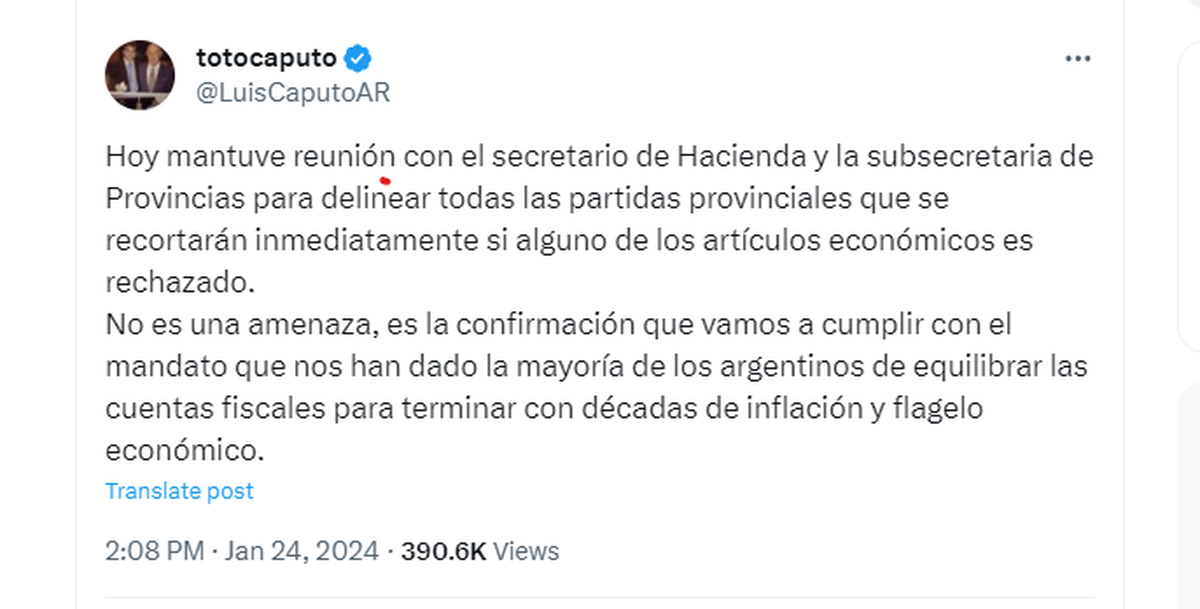 "No es una amenaza, es la confirmación que vamos a cumplir con el mandato que nos han dado la mayoría de los argentinos de equilibrar las cuentas fiscales para terminar con décadas de inflación y flagelo económico", avisó Caputo.