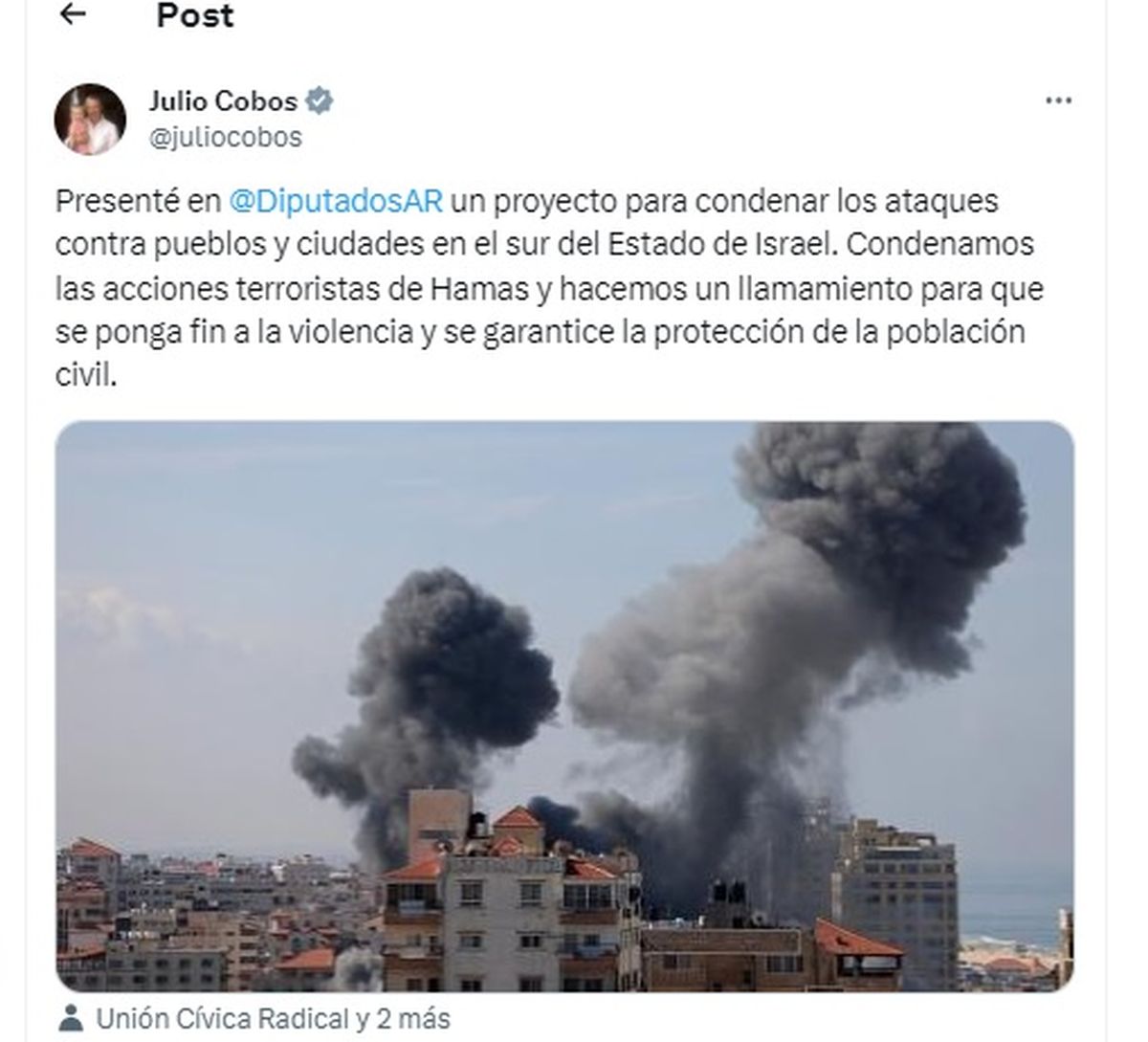 En un proyecto de declaración que elaboró este sábado por la mañana, Cobos destacó que el Gobierno argentino condenó las acciones terroristas de Hamas contra el territorio israelí e hizo un llamamiento para que se ponga fin a la violencia y se garantice la protección de la población civil.