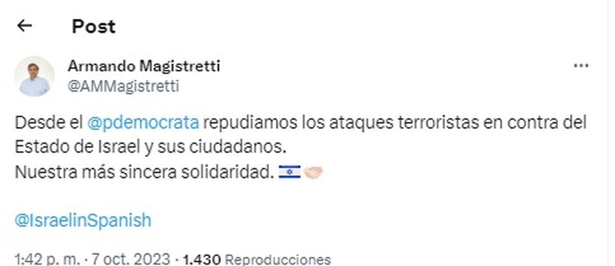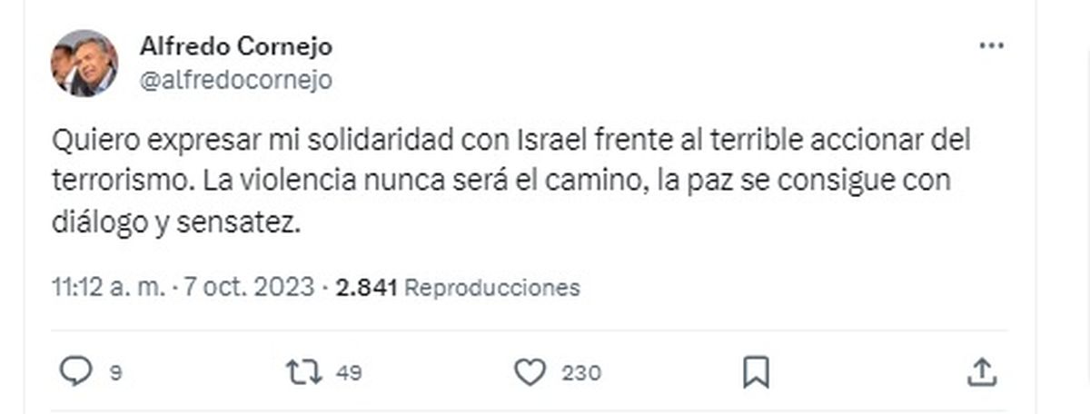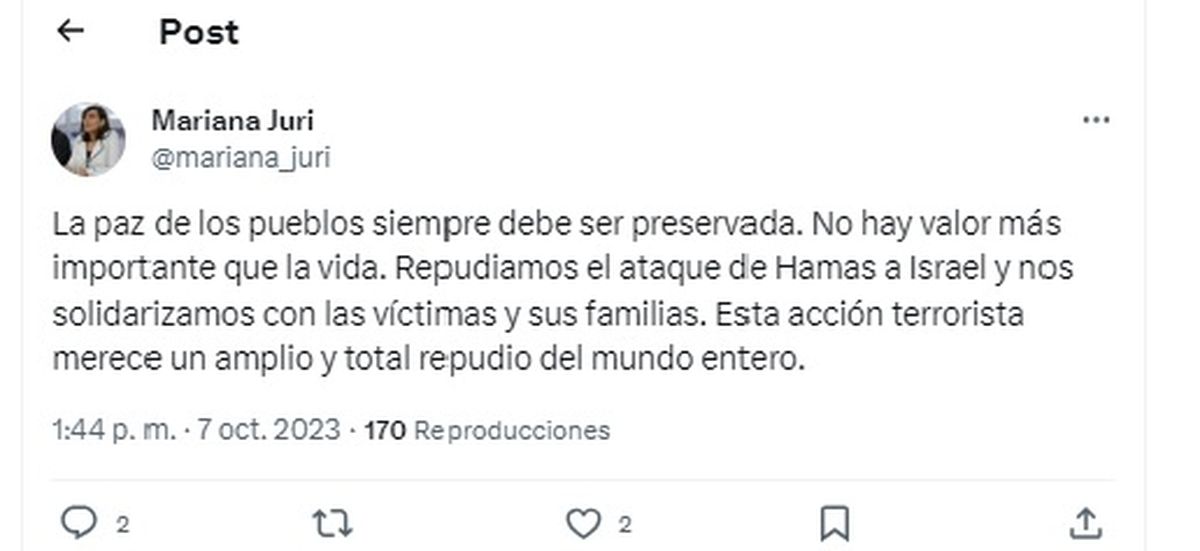 En poteos de Twitter, los legisladores nacionales Julio Cobos, Mariana Juri, Alfredo Cornejo -quien además es gobernador electo- y el presidente del PD Armando Magistretti -representante local de La Libertad Avanza, partido de Javier Milei- declararon su repudio a los hechos cometidos por el brazo armado de la organización palestina