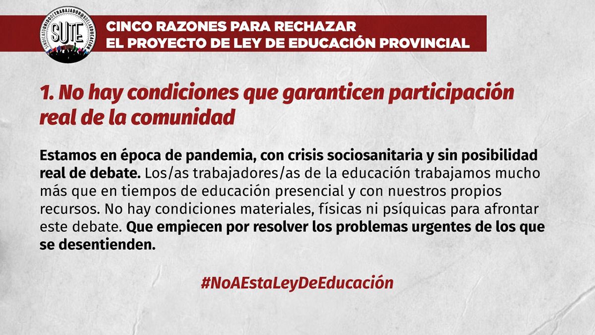 Por tanto, en ese sindicato marcan como prioritario que "no están dadas las condiciones que garanticen una verdadera participación de la comunidad educativa en el debate". Remarcan que los docentes están sobrecargados en este modelo de educación virtual y no se pueden garantizar las condiciones físicas ni materiales para que participen de la discusión que supone analizar un proyecto de ley.