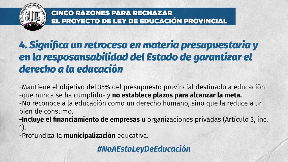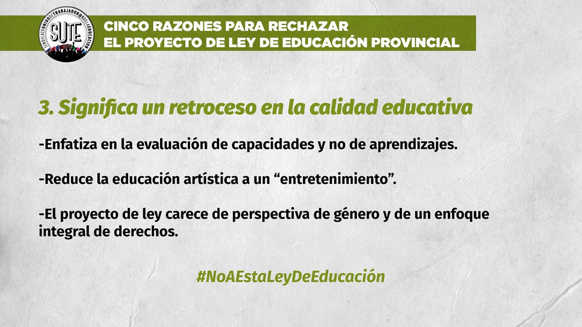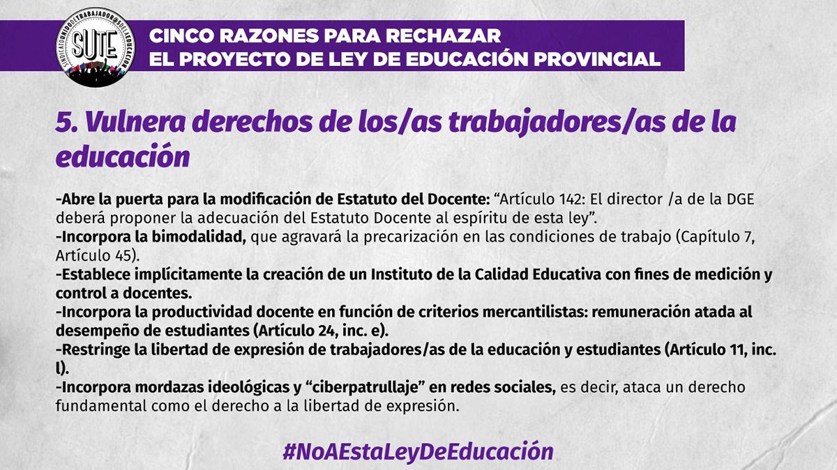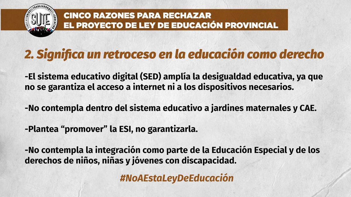 El mismo día en que se hizo público el anteproyecto de la Ley de Educación provincial que impulsa el Gobierno, desde el SUTE, el gremio que representa a los docentes, salieron a refutar 5 puntos principales de la iniciativa oficial. "Significa un retroceso en la calidad educativa, en la educación como derecho y también en materia presupuestaria, pero además vulnera los derechos de los docentes", sintetizaron desde el gremio.