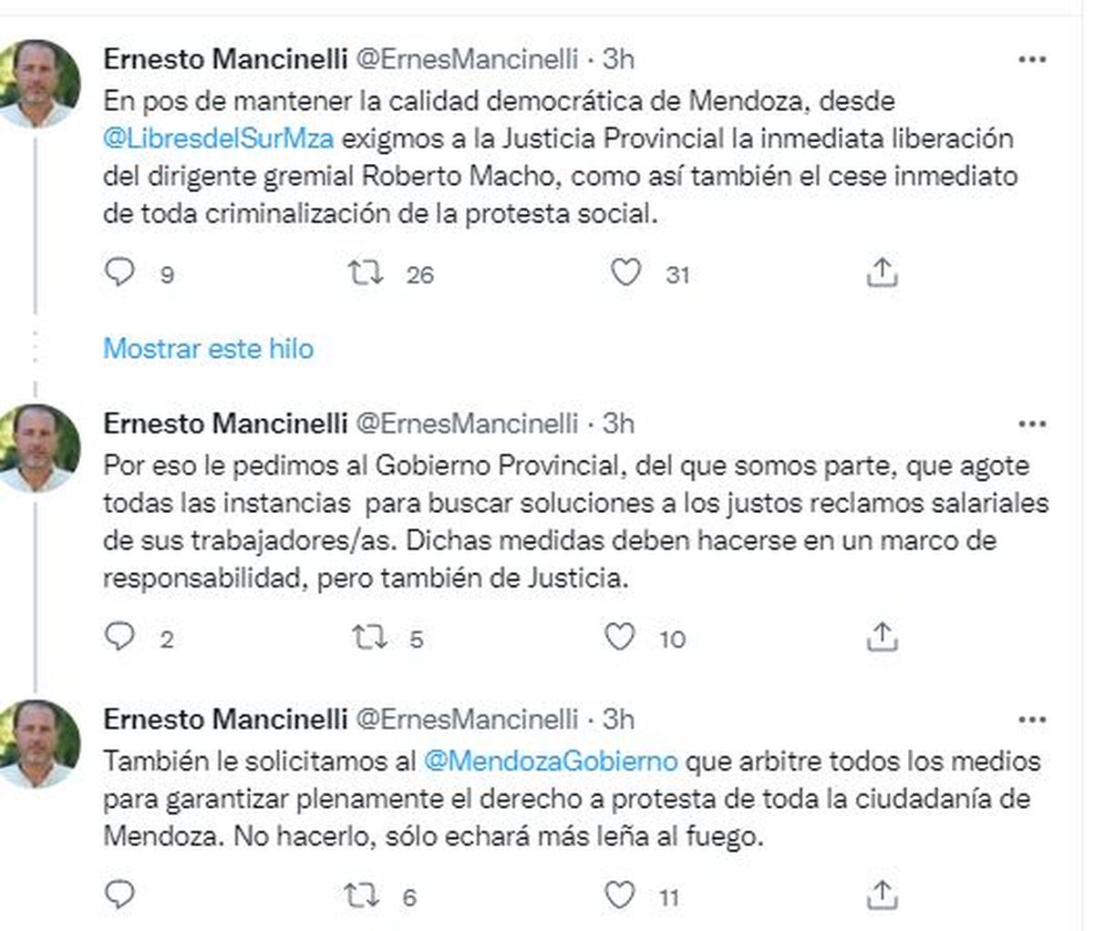 No sólo el peronismo, la izquierda y movimientos sociales y de derechos humanos reclamaron la liberación del Roberto Macho, el líder de ATE detenido el martes. También lo hizo Libres del Sur, que es aliado del frente Cambia Mendoza y que incluso cuenta con referentes en cargos legislativos como es el caso del senador provincial Ernesto Mancinelli.