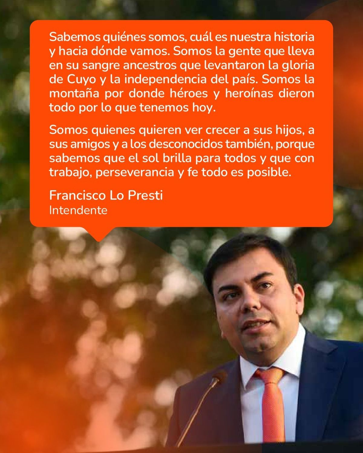 "Sabemos quiénes somos, cuál es nuestra historia y hacia dónde vamos. Somos la gente que lleva en su sangre ancestros que levantaron la gloria de Cuyo y la independencia del país. Somos la montaña por donde héroes y heroínas dieron todo por lo que tenemos hoy. Somos el barrendero de la plaza con las manos callosas y con mucho orgullo, la kiosquera que juntó para emprender con todo el coraje del mundo y en contra de todos los vientos, la familia que sostiene la farmacia que fundó el abuelo (...)", manifestó Lo Presti, tras el reconocimiento a los trabajadores.