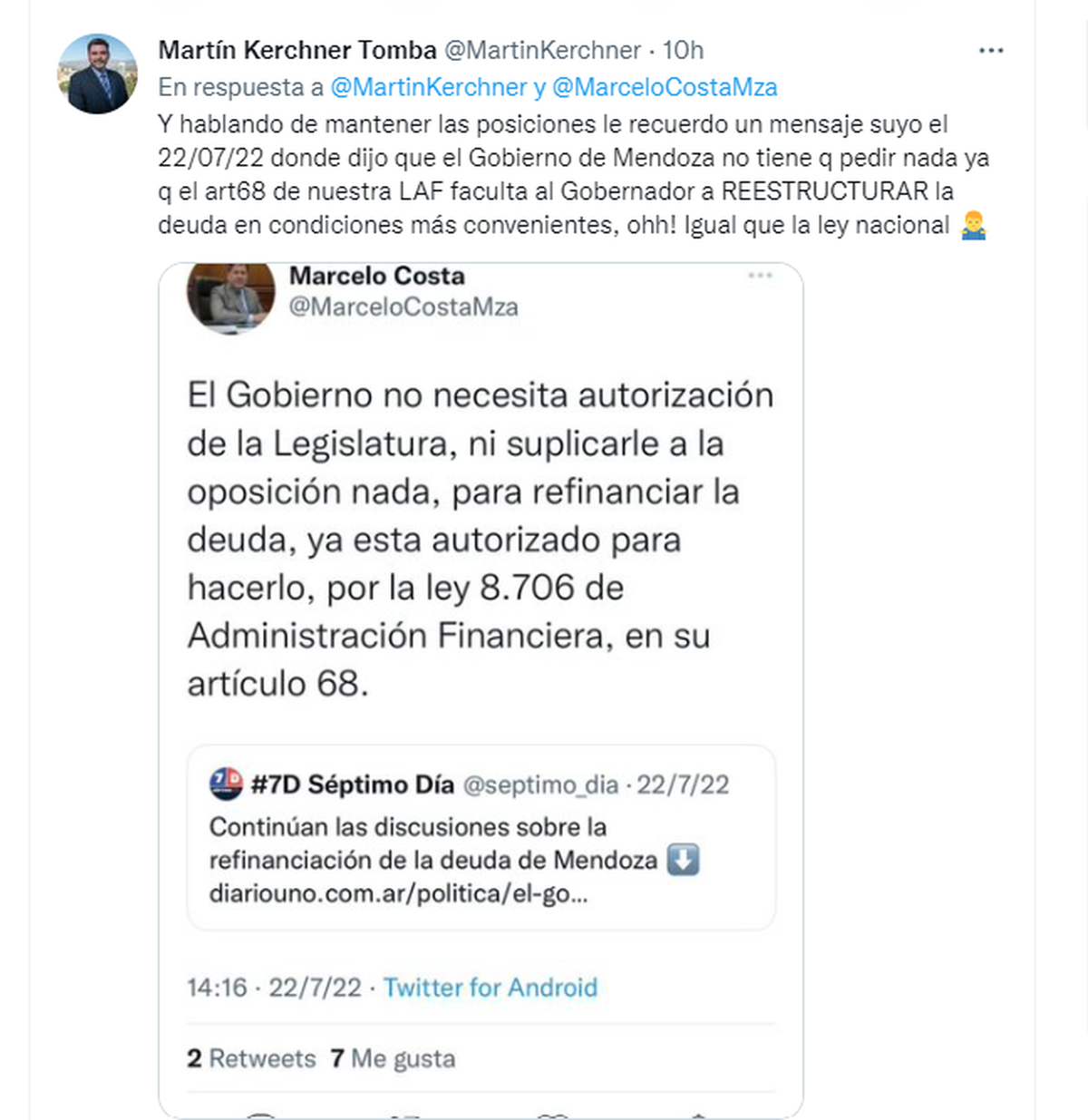 El legislador también apeló a su Twitter para recordar un posteo que hiciera Costa cuando se debatía la refinanciación de la deuda en el programa Séptimo Día, en donde el ex ministro de Paco Pérez aseguraba que el Gobierno no necesitaba suplicarle a la oposición que avalara el roll over, porque eso ya lo tenía en la ley de administración financiera.