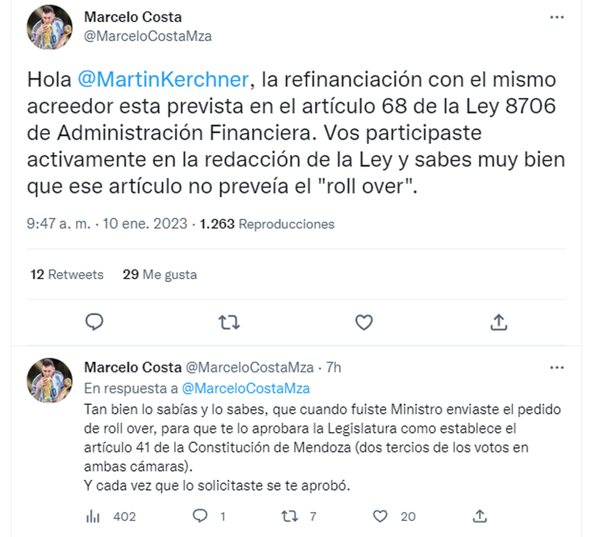 Desde el 29 de diciembre pasado cuando se conoció el decreto con el que Rodolfo Suarez pretende refinanciar la deuda de Mendoza que vence este año, ya hubo un dictamen contrario del fiscal de Estado y dos demandas de inconstitucionalidad, del PJ y el Partido Verde en la Suprema Corte. Ahora dos ex ministros de Hacienda, Marcelo Costa y Martín Kerchner, se cruzaron en Twitter por la estrategia de aprobar el roll over sin pasar por la Legislatura.