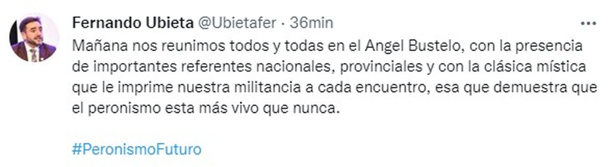 Y uno que sorprendió fue el doctor Jorge Pujol, que explicitó su apoyo al encuentro: "El PJ de Mendoza pretende ver hacia el Futuro. Adhiero un 100%. Mendoza necesita ganar de una buena vez", puso en su perfil de Twitter. El año pasado, Pujol se presentó por afuera del partido, tras una campaña en la que cuestionó fuertemente a la conducción.