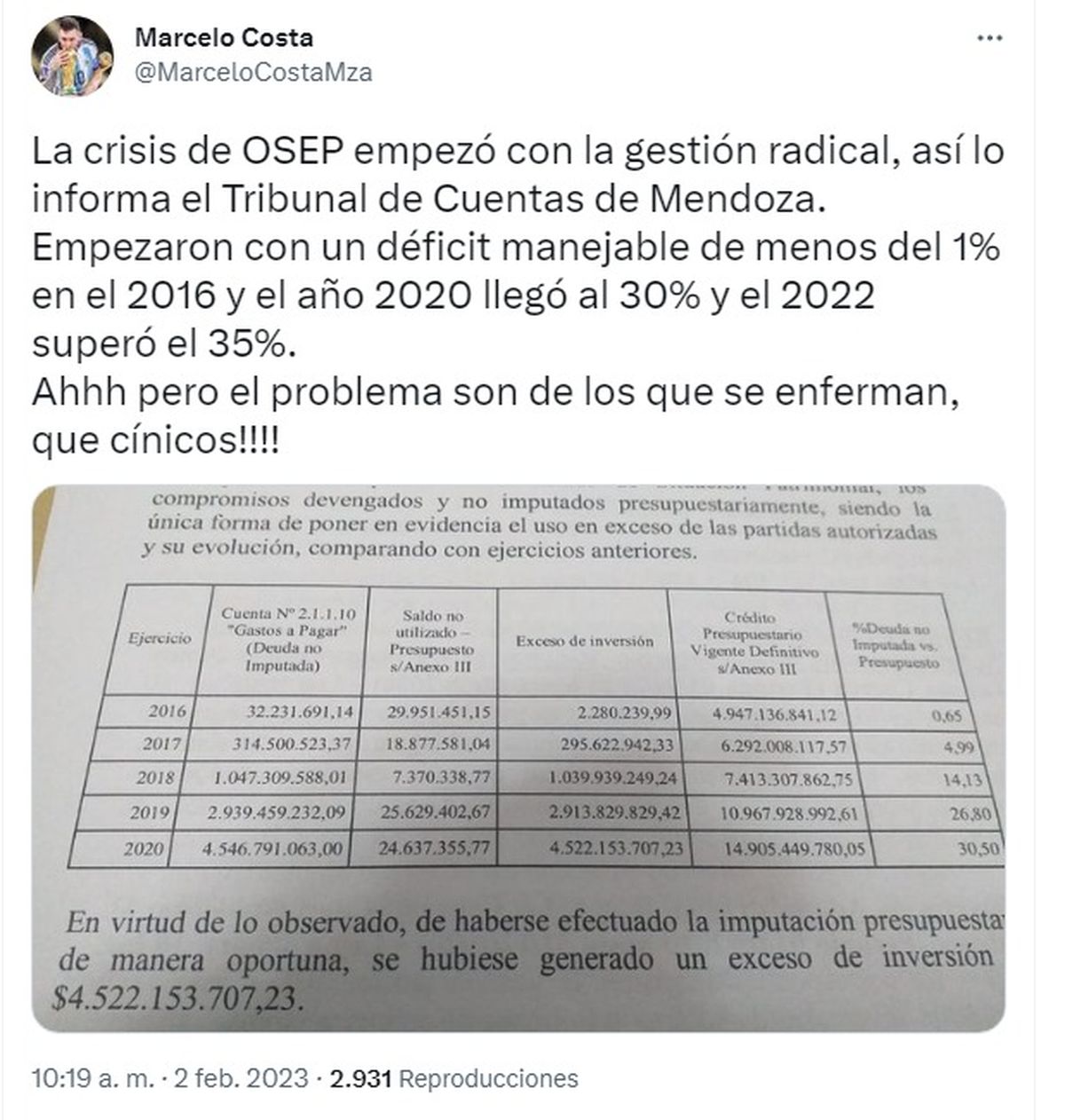 El síndico del Banco Nación, el peronista Marcelo Costa, tuiteó que "la crisis de OSEP empezó con la gestión radical"