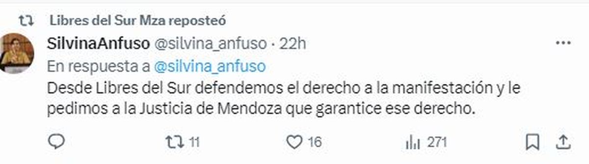 "Nuestro país atraviesa momentos muy difíciles debido al brutal ajuste económico que golpea a múltiples sectores de nuestra sociedad. Insistimos: La respuesta no puede ser la criminalización de la protesta. Desde Libres del Sur defendemos el derecho a la manifestación y le pedimos a la Justicia de Mendoza que garantice ese derecho", añadió.