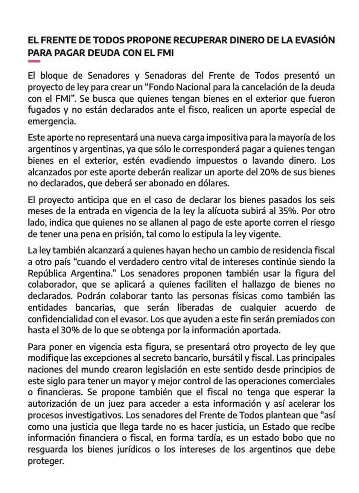 "Quienes se beneficiaron con los recursos del FMI, fugaron divisas de la Argentina y no las declararon -acto profundamente lesivo para los contribuyentes de nuestra Nación– son los que deben hacer el mayor esfuerzo contributivo y a quienes en definitiva apunta este proyecto de ley para amortizar la deuda con el FMI. Es un acto de estricta justicia distributiva, tributaria e histórica", subraya el comunicado. encontrar a los autores".