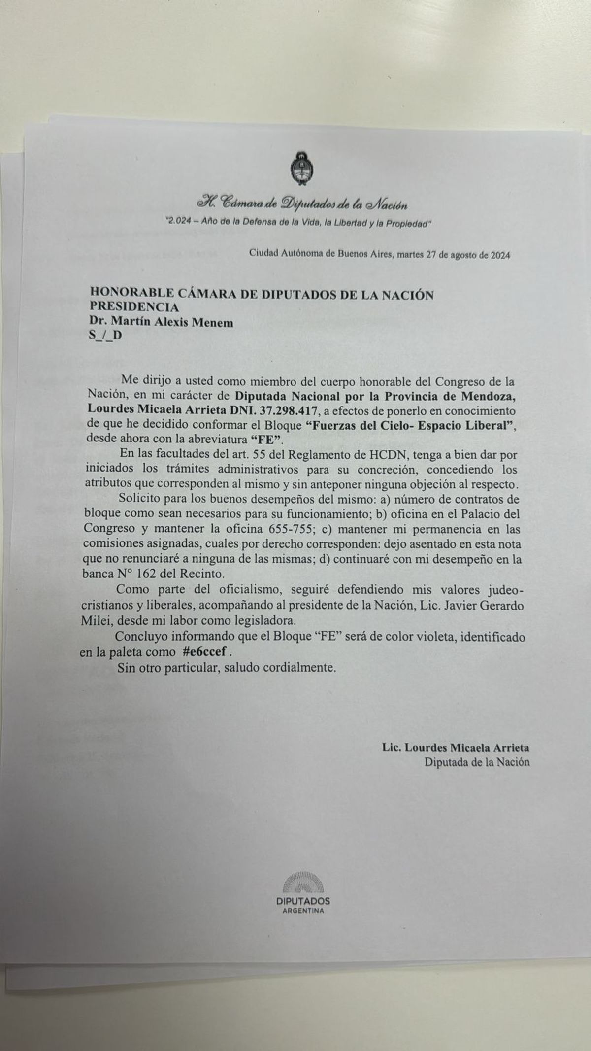 La diputada nacional, Diez Villagra Romina Andrea, escribió una nota al presidente de la Cámara de Diputados, Martín Menem, advirtiendo que Lourdes Arrieta no pertenecerá más al bloque de La Libertad Avanza.