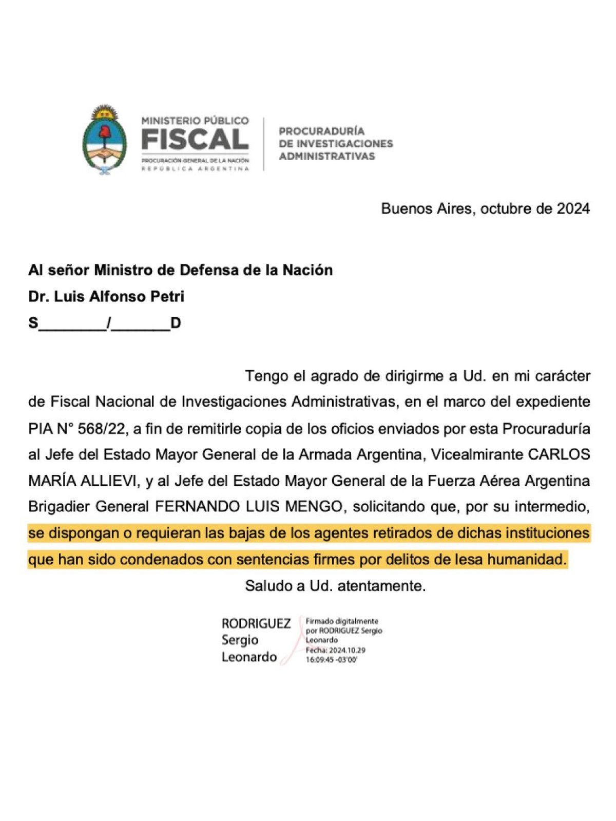 El requerimiento del Ministerio Público Fiscal enviado directamente a Luis Petri dice que se debe "disponer las bajas de agentes retirados de dichas instituciones (fuerzas armadas) que han sido condenados con sentencias firmes por delitos de lesa humanidad".