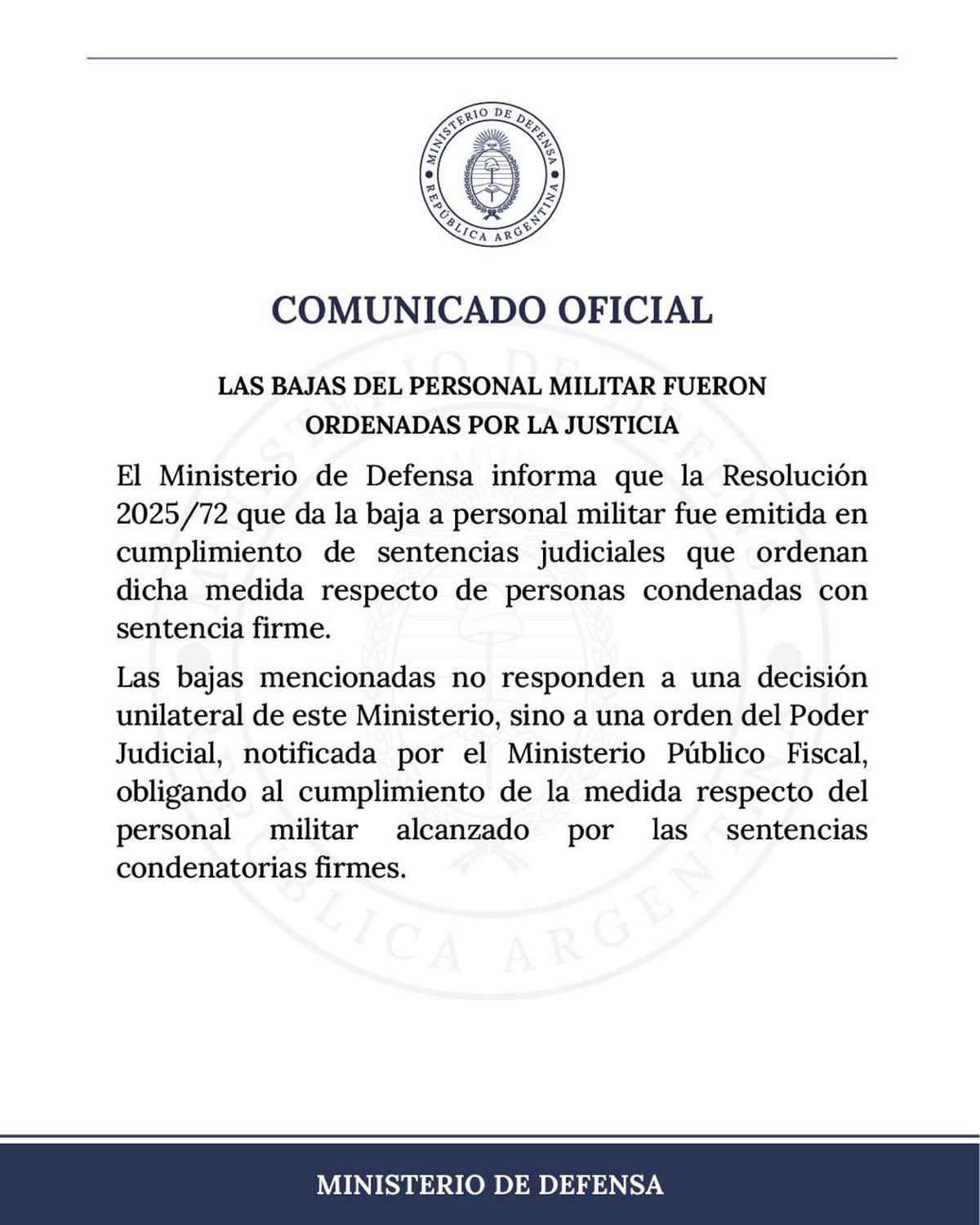 Y agrega: "Las bajas mencionadas no responden a una decisión unilateral de este Ministerio, sino a una orden del Poder Judicial, notificada por el Ministerio Público Fiscal, obligando al cumplimiento de la medida respecto del personal militar alcanzado por las sentencias condenatorias firmes".