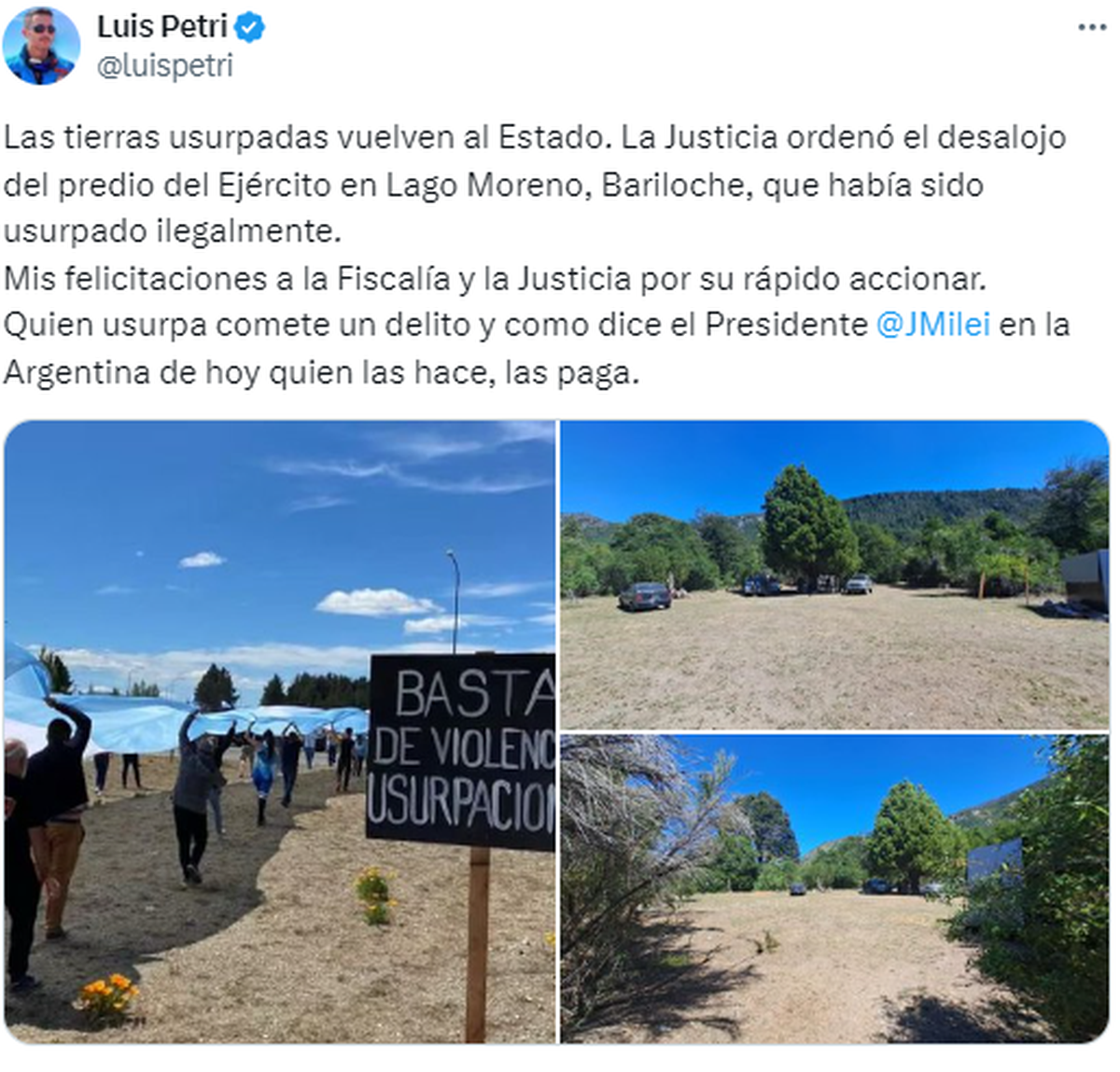 "Frente a la ocupación ilegal en tierras del Ejército Argentino en Bariloche, tomamos acción. El Ministerio de Defensa intervino rápidamente y se desalojó el predio. Se acabó la impunidad, la ley se cumple y las tierras se defienden. ¡El que las hace, las paga!", publicó días atrás en su perfil personal de X el ministro Petri.